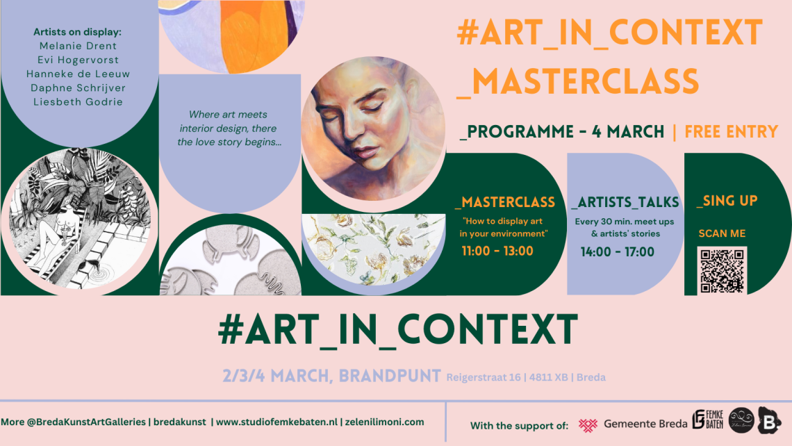 In addition to the open display which everyone can visit and explorer, #Art_in_Context is also giving the public the opportunity to participate in a completely free of charge Masterclass on the topic of Interior design and how to display art in your own environment. There are some very hot topics which will be covered during this two and half hours interactive session such as light and colour pallets, framing, sizes and more. But you should be fast to sign for you as the sites at the spot are limited to 15 and the rules is “first call, first served”. The good news is that the organizers are also promising an online option for participation, which is also holding some limitation of the interactive experience. So, if you plan to be at Breda centre on 4th of March, between 11h and 13h, better reserve your free spot for the live session already today.